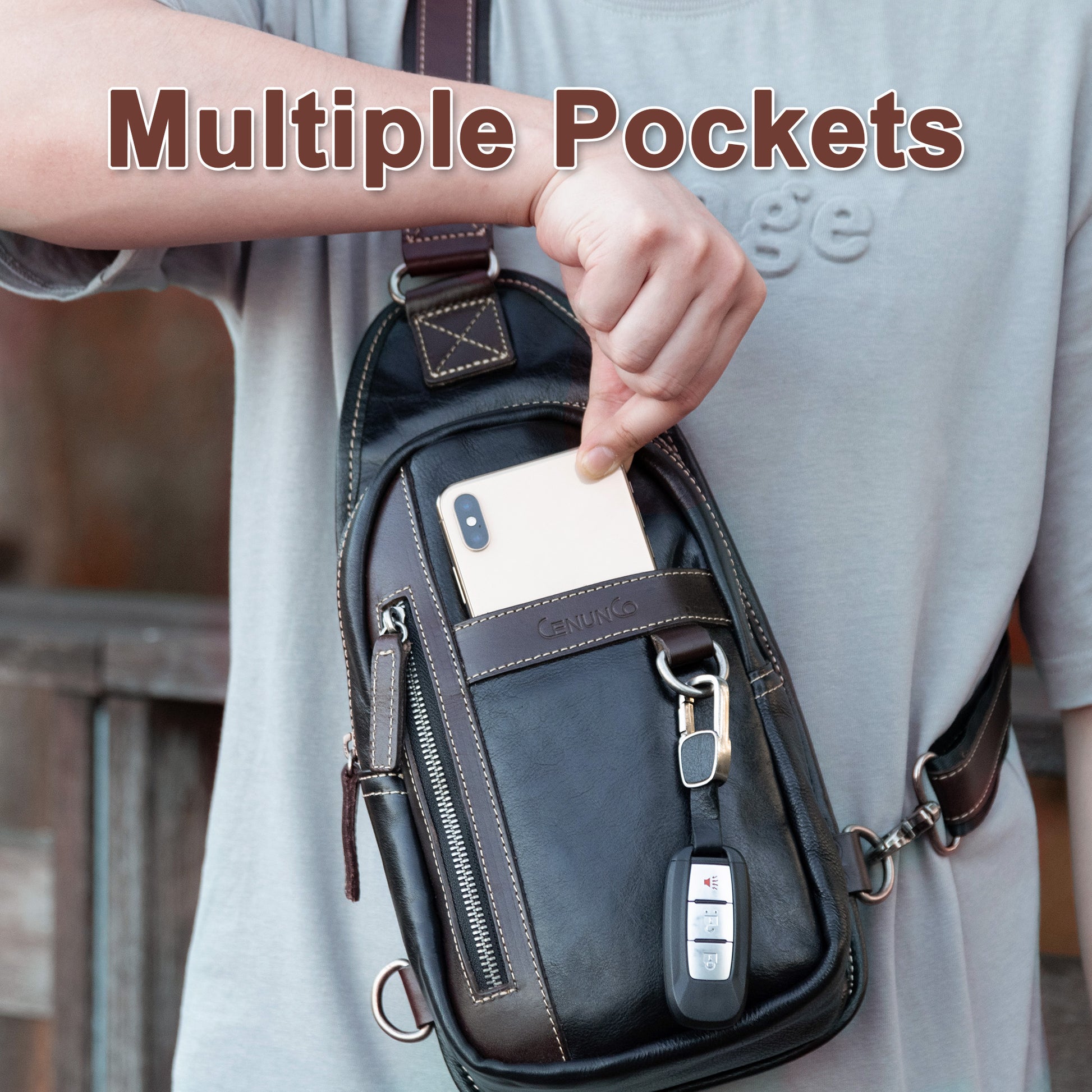 - EVERYDAY ESSENTIAL – CENUNCO Chest Sling Bag has 1 zipper pocket and 2 slip pockets on the outside while the internal structure has 1 slip pocket and 1 zipper pocket