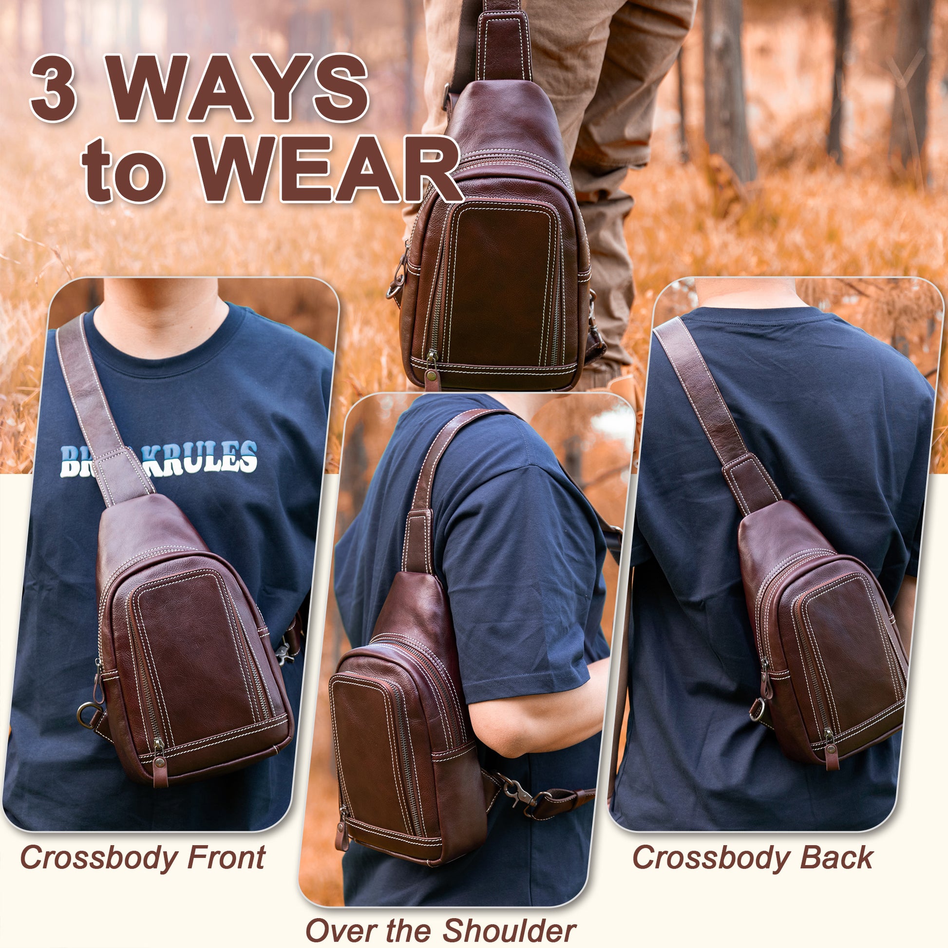 - GENUINE LEATHER SLING CHEST BAG – This sling bag for men and women was made of genuine leather, combine with comfortable cotton lining and heavy duty metal zippers, this leather bag is suitable for hiking, cycling, and daily travel