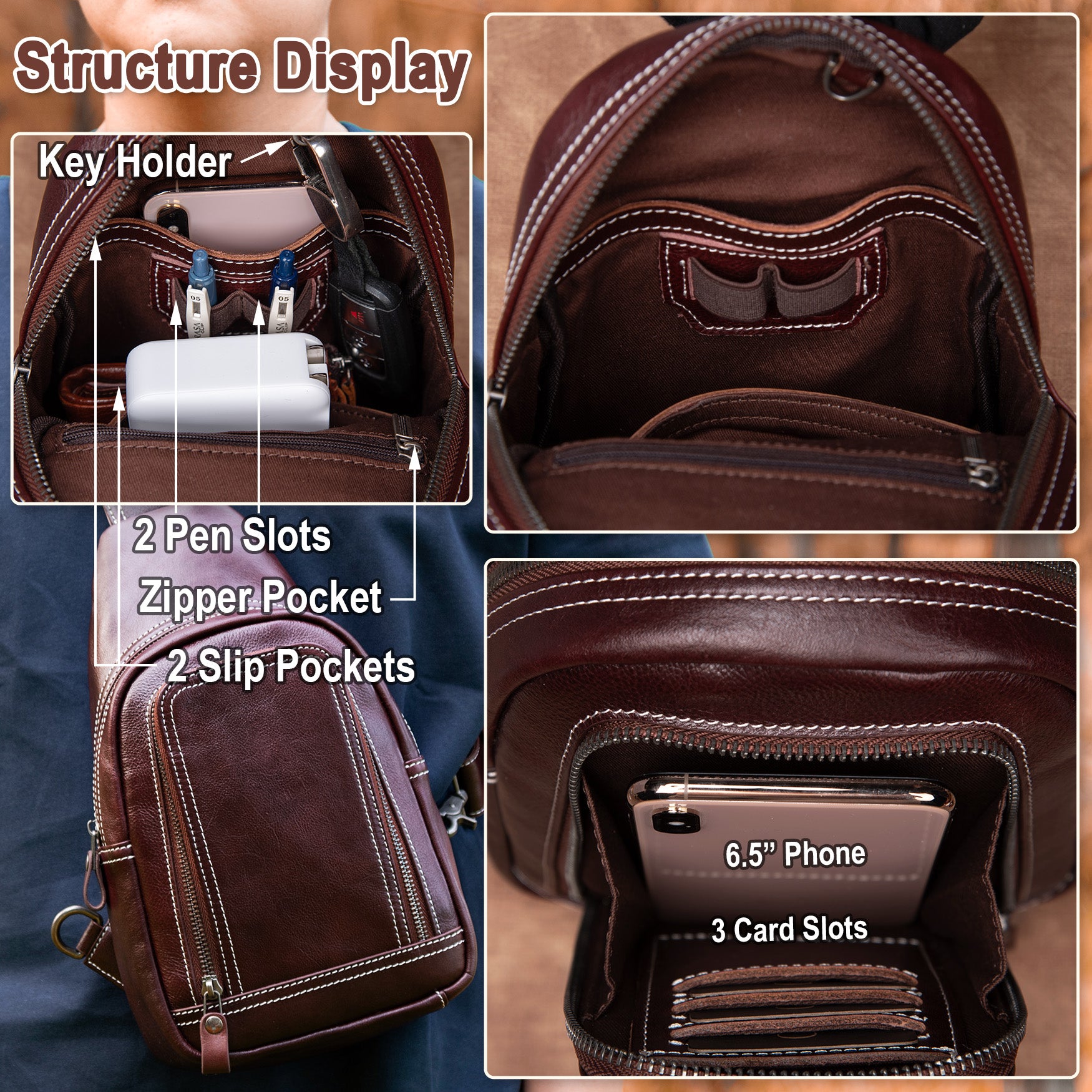 - EVERYDAY ESSENTIAL – CENUNCO Chest Sling Bag has 3 zipper pockets on the outside while the internal structure has 3 card slots, 2 slip pockets, 2 pen slots, a zipper pocket, and a key hanger ring – you won't even need a wallet