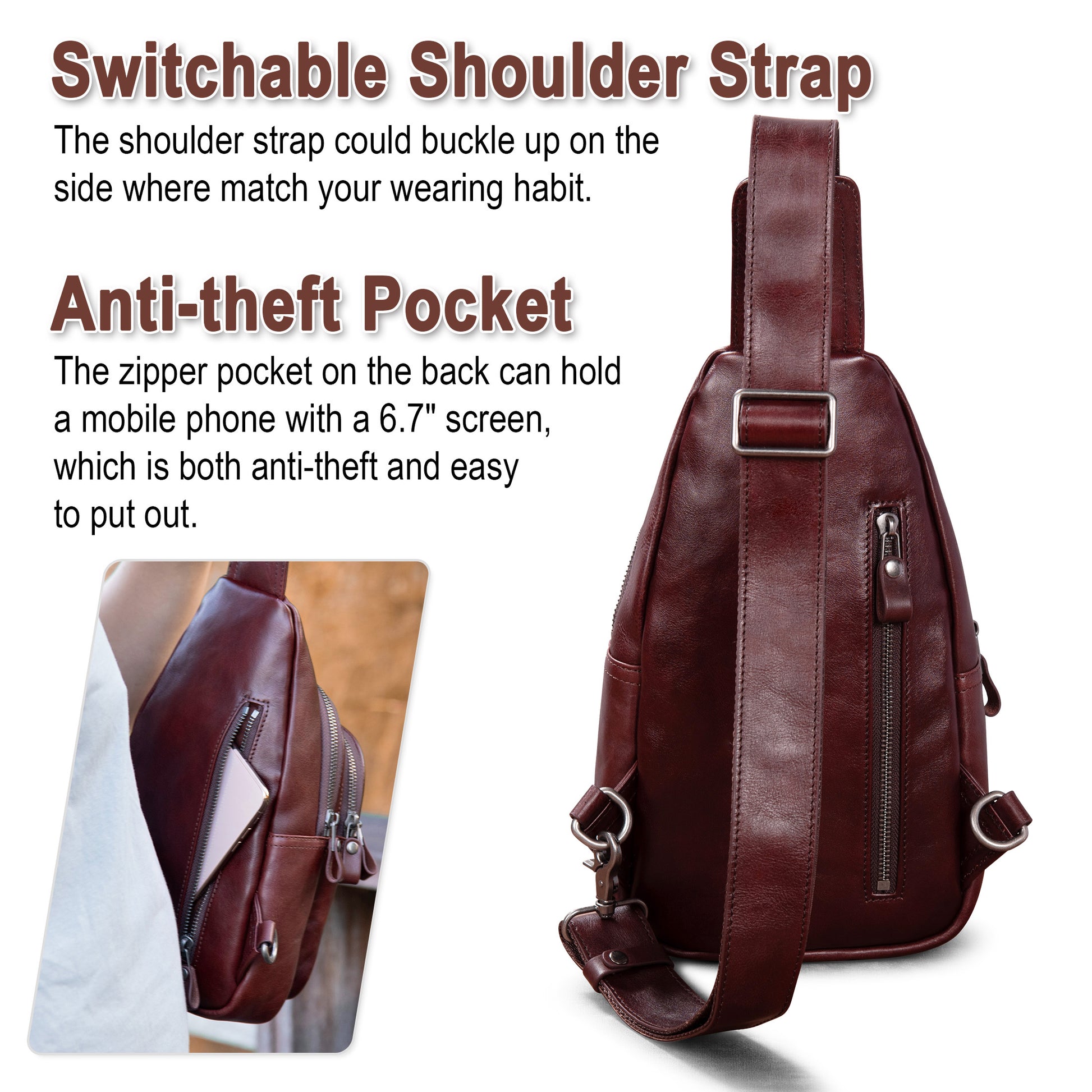 ANTI-THEFT SECURITY – There is a zipper pocket on the back of this leather crossbody bag that protects your phone from being stolen. The bag is made to always remain in your sight to significantly reduce the risk of it being snatched