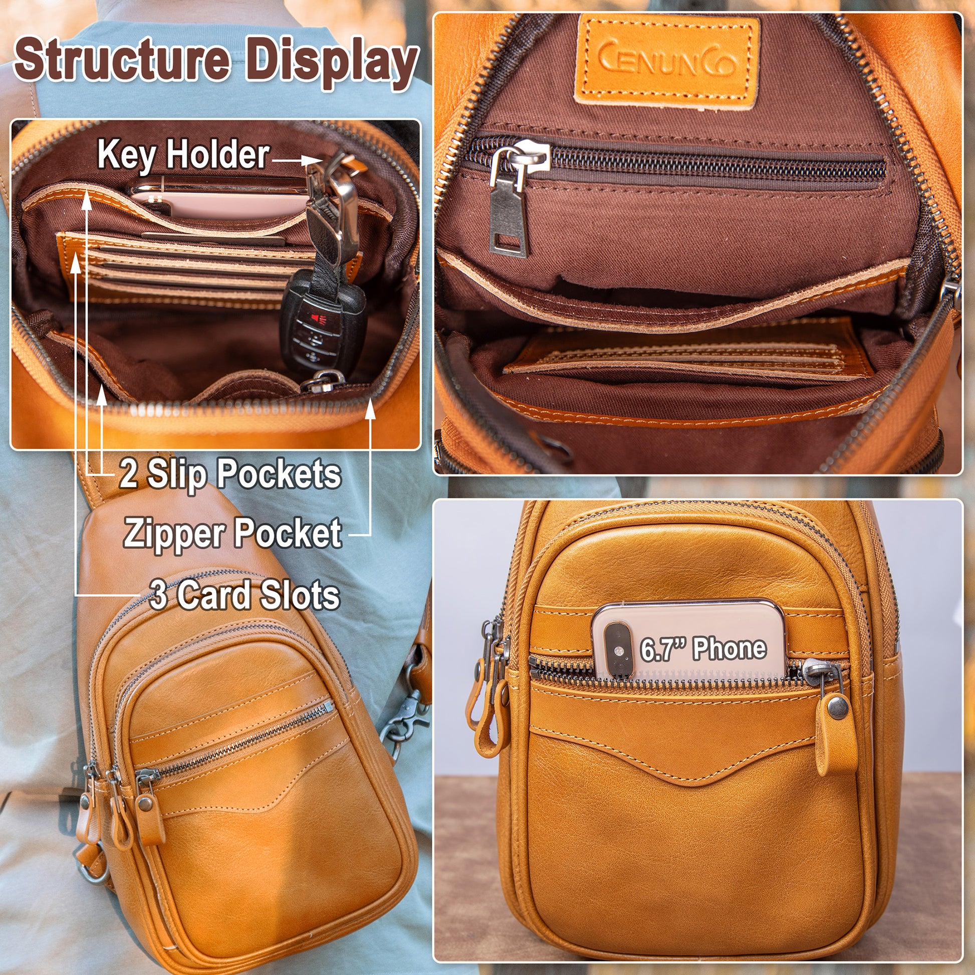 - EVERYDAY ESSENTIAL – CENUNCO Chest Sling Bag has 3 zipper pockets on the outside (all but the smallest one fit phones) while the internal structure has 3 card slots, 3 slip pockets, a zipper pocket, and a key hanger ring – you won't even need a wallet