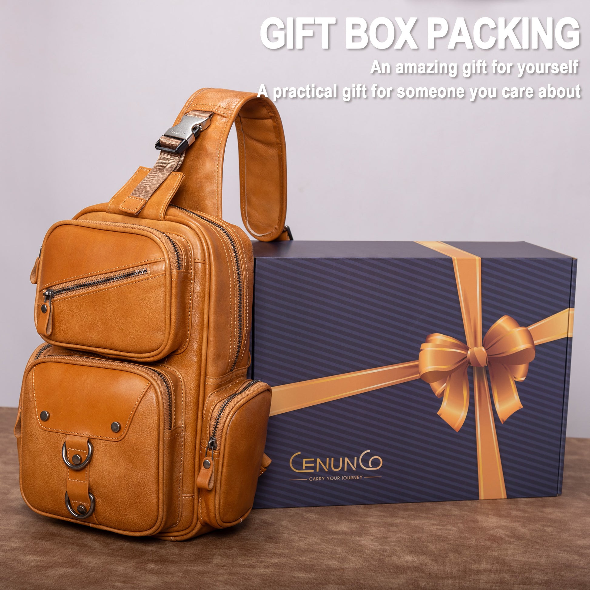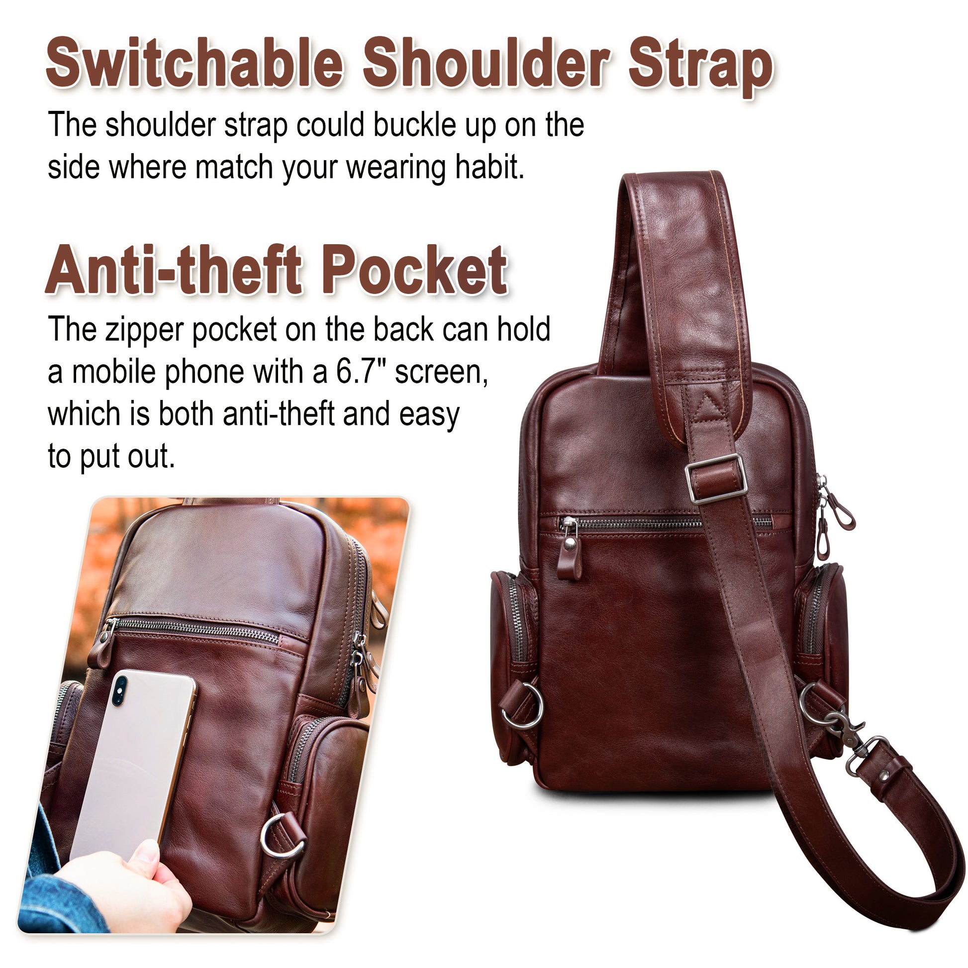 - GENUINE LEATHER SLING CHEST BAG – This high capacity sling chest bag for men have an elegant genuine leather exterior and a contrasting heavy duty cotton inner lining. Highly adaptable, this leather bag is suitable for hiking, cycling, and daily travel